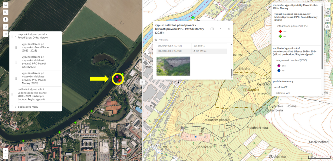 V datech nadlimitních výpustí státní vodohospodářské bilance z let 2020 – 2024 a v datech zmapovaných výpustí jsou pochopitelně případy "duplicit", kdy data zmapovaných výpustí v některých případech "duplikují" data nadlimitních výpustí ze státní vodohospodářské bilance, ale liší se například polohou (viz například žlutě označený případ na obrázku výše). V rámci dalšího řešení projektu bude tedy nezbytné těchto více zdrojů "sjednotit" do jednoho datového zdroje bez duplicit (jednoznačně určit polohu výpustí, připojit fotografie tam, kde jsou k dispozici apod.).